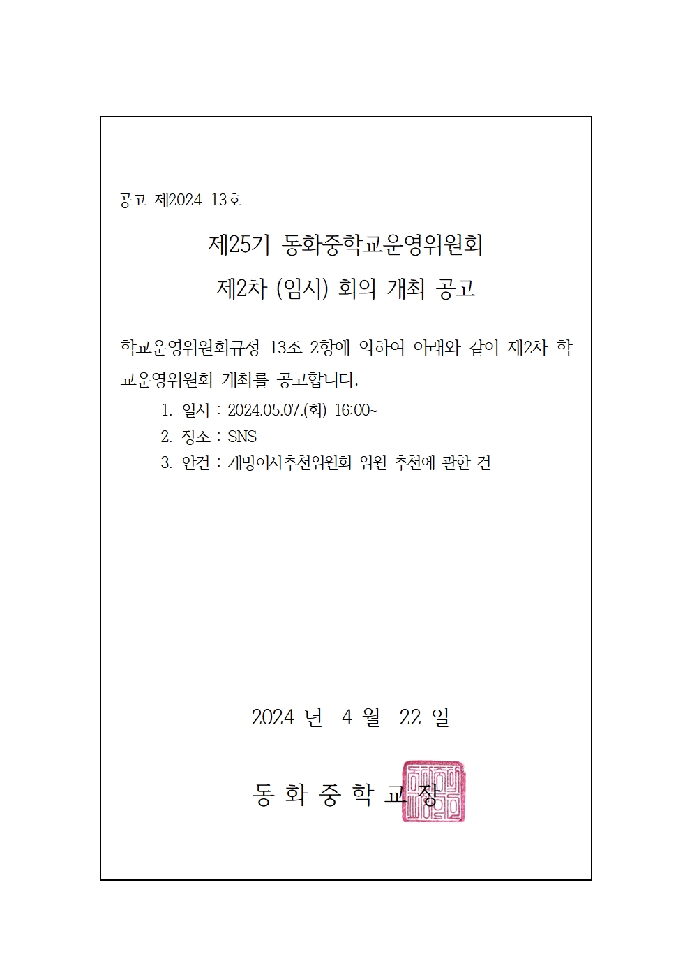 Á¦25±â µ¿È­ÁßÇб³¿î¿µÀ§¿øÈ¸ 2Â÷ ȸÀÇ °³ÃÖ ¾È³»