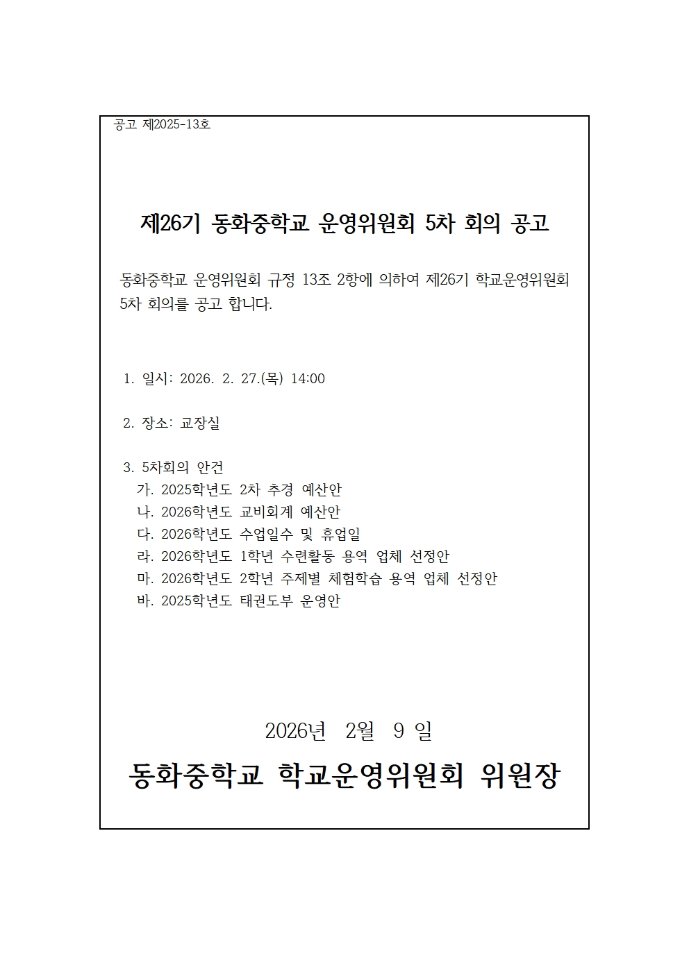 Á¦26±â µ¿È­ÁßÇб³ ¿î¿µÀ§¿øÈ¸ 4Â÷ ȸÀÇ ¾È³»