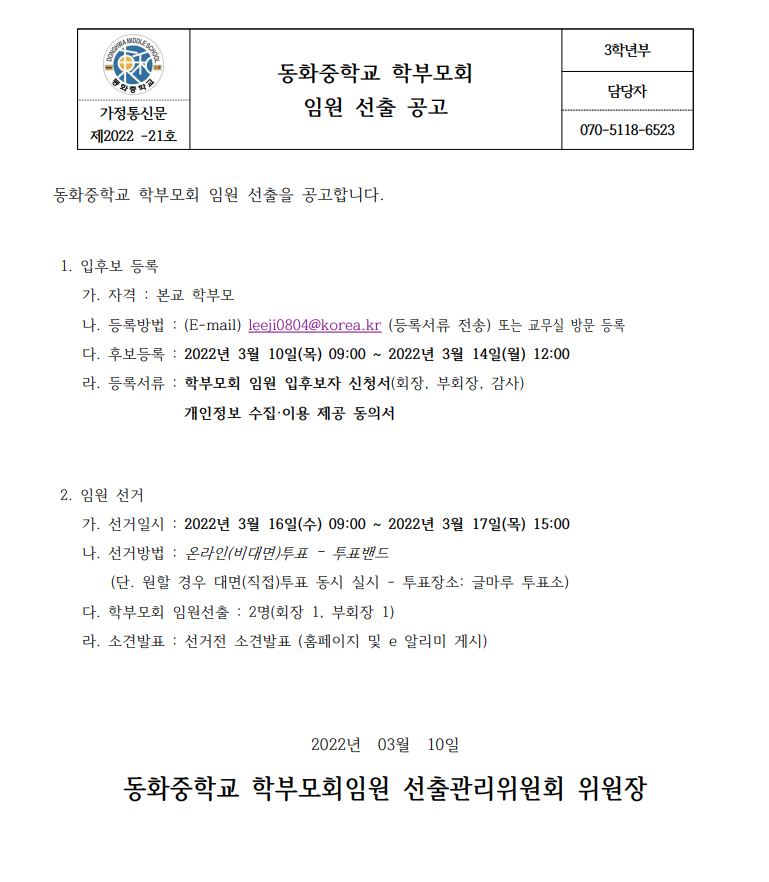 µ¿È­ÁßÇб³ Çкθðȸ ÀÓ¿ø ¼±Ãâ °ø°í