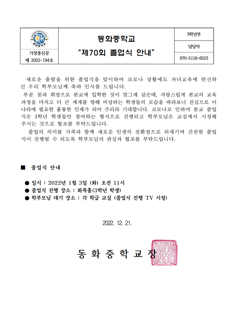 µ¿È­ÁßÇб³ "Á¦70ȸ Á¹¾÷½Ä ¾È³»"