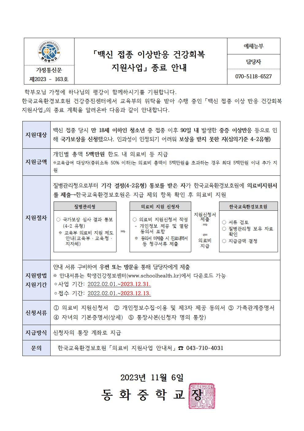 ¹é½Å Á¢Á¾ ÀÌ»ó¹ÝÀÀ °Ç°­È¸º¹ Áö¿ø»ç¾÷ Á¾·á ¾È³»