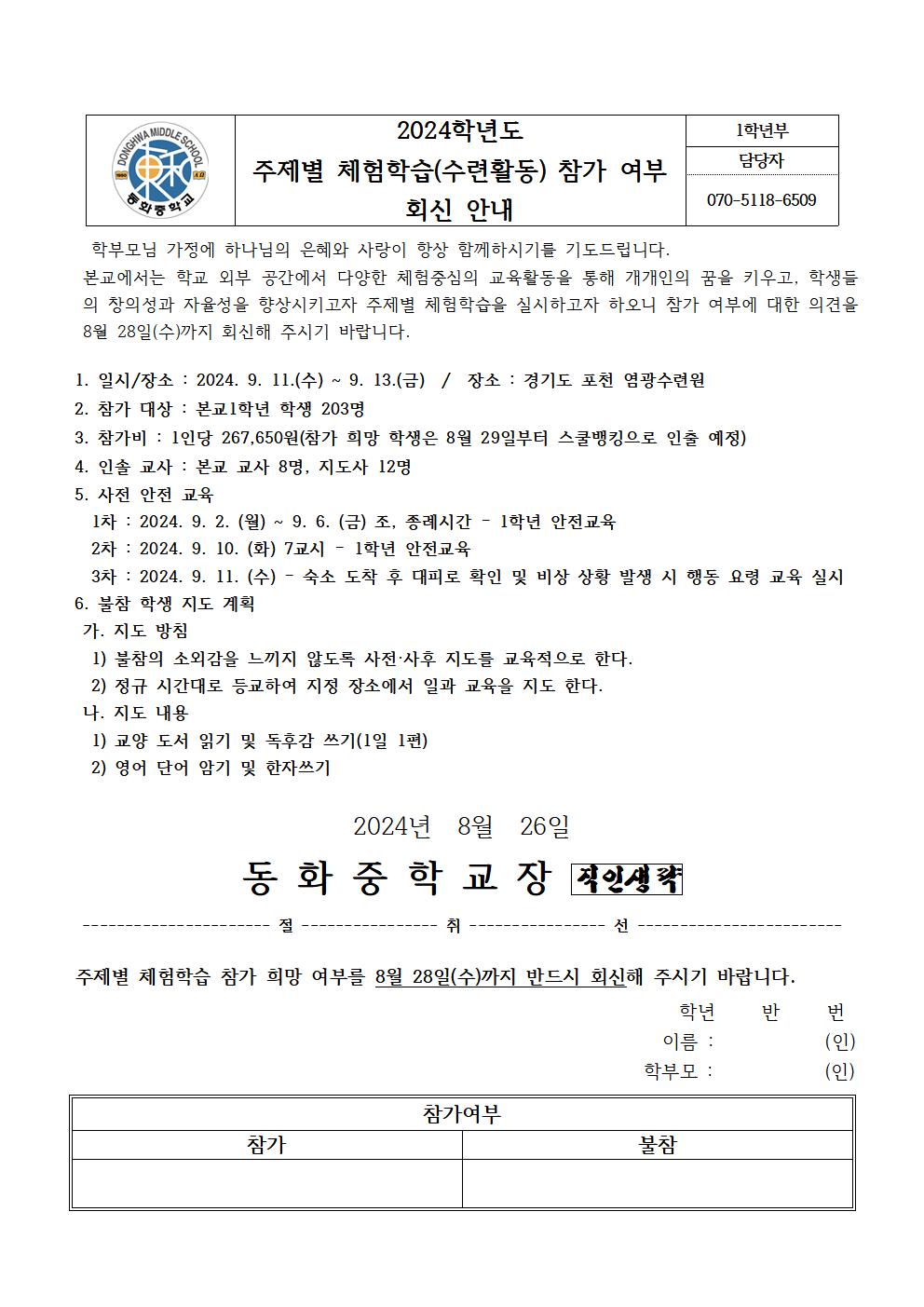 2024Çг⵵ ÁÖÁ¦º° üÇèÇнÀ(¼ö·ÃȰµ¿) Âü°¡ ¿©ºÎ ȸ½Å ¾È³»