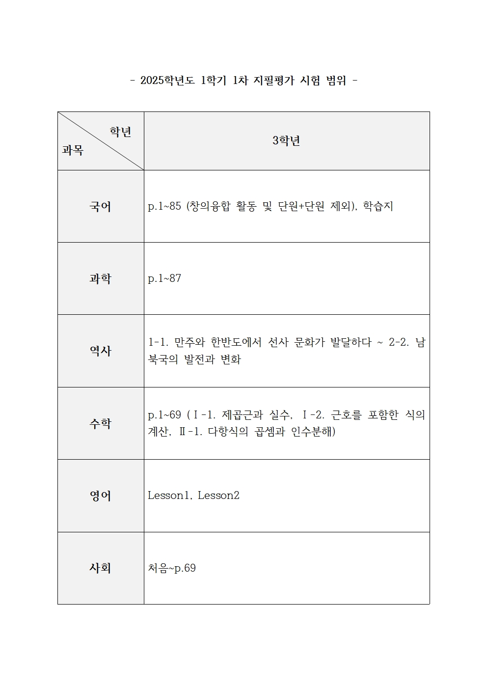 2025Çг⵵ 3Çгâ 1Çбâ 1Â÷ ÁöÇÊÆò°¡ ½Ã°£Ç¥ ¹× ½ÃÇè ¹üÀ§ ¾È³»