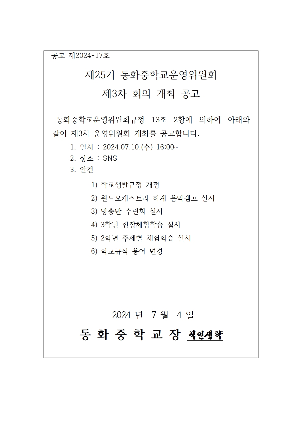 Á¦25±â µ¿È­ÁßÇб³¿î¿µÀ§¿øÈ¸ 3Â÷ ȸÀÇ °³ÃÖ ¾È³»