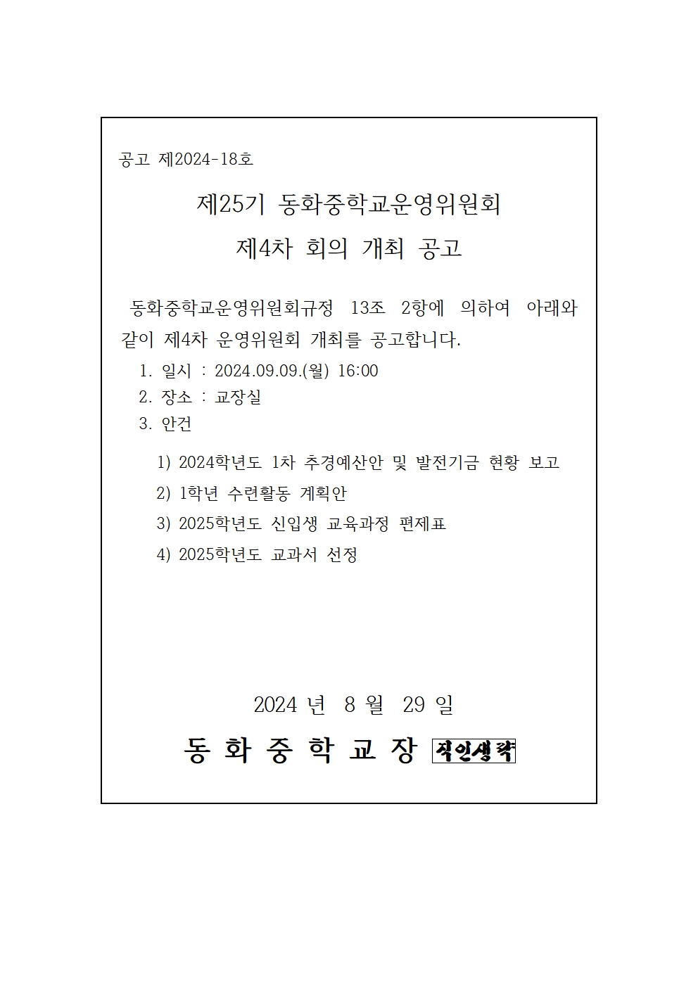 Á¦25±â µ¿È­ÁßÇб³¿î¿µÀ§¿øÈ¸ 4Â÷ ȸÀÇ °³ÃÖ ¾È³»